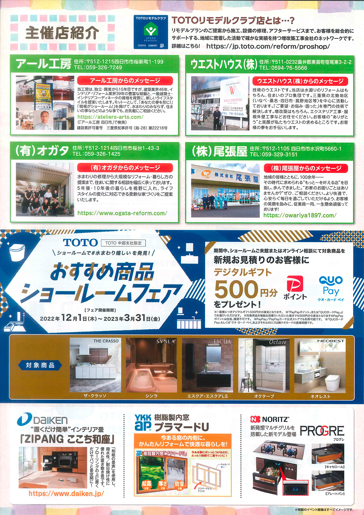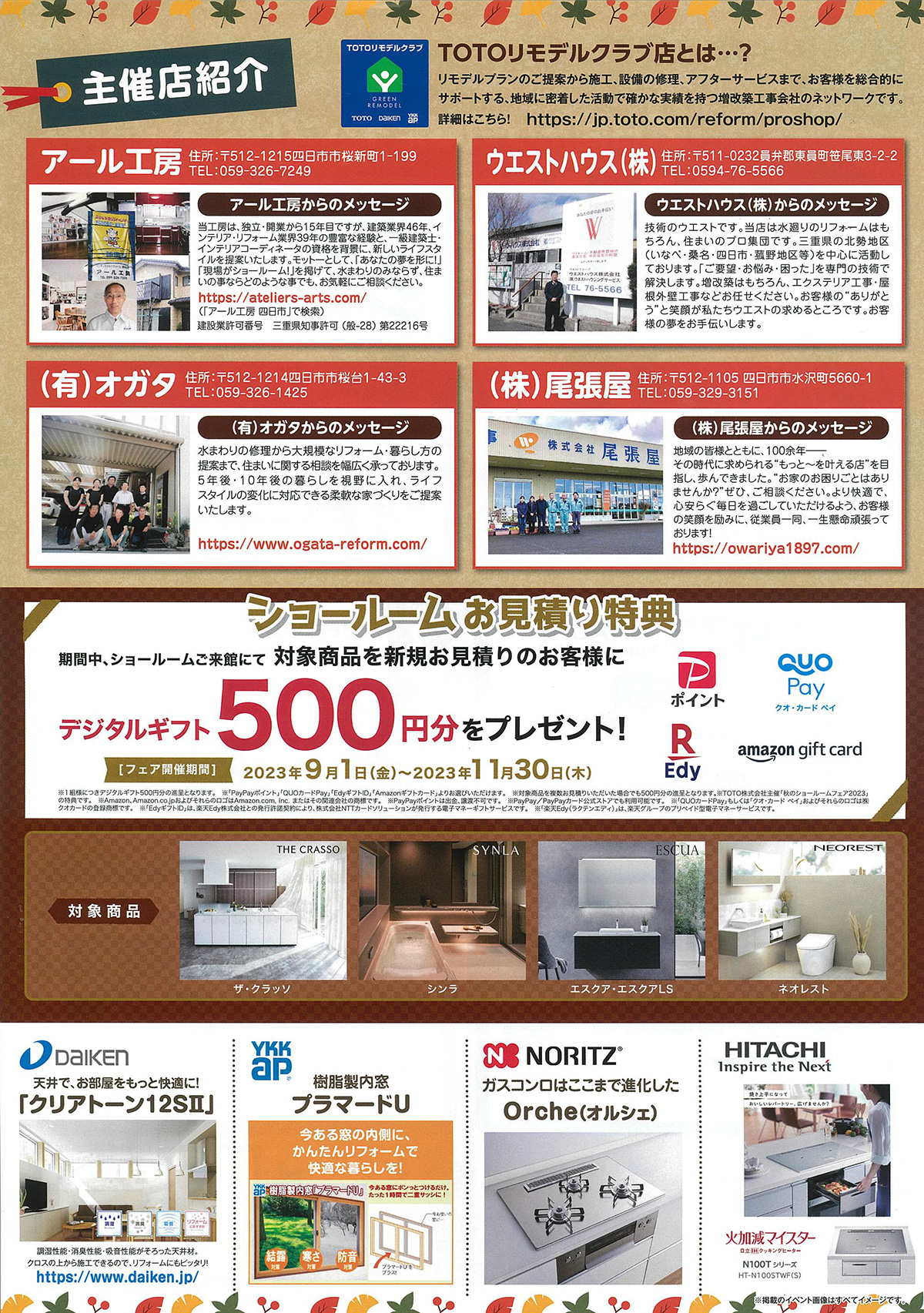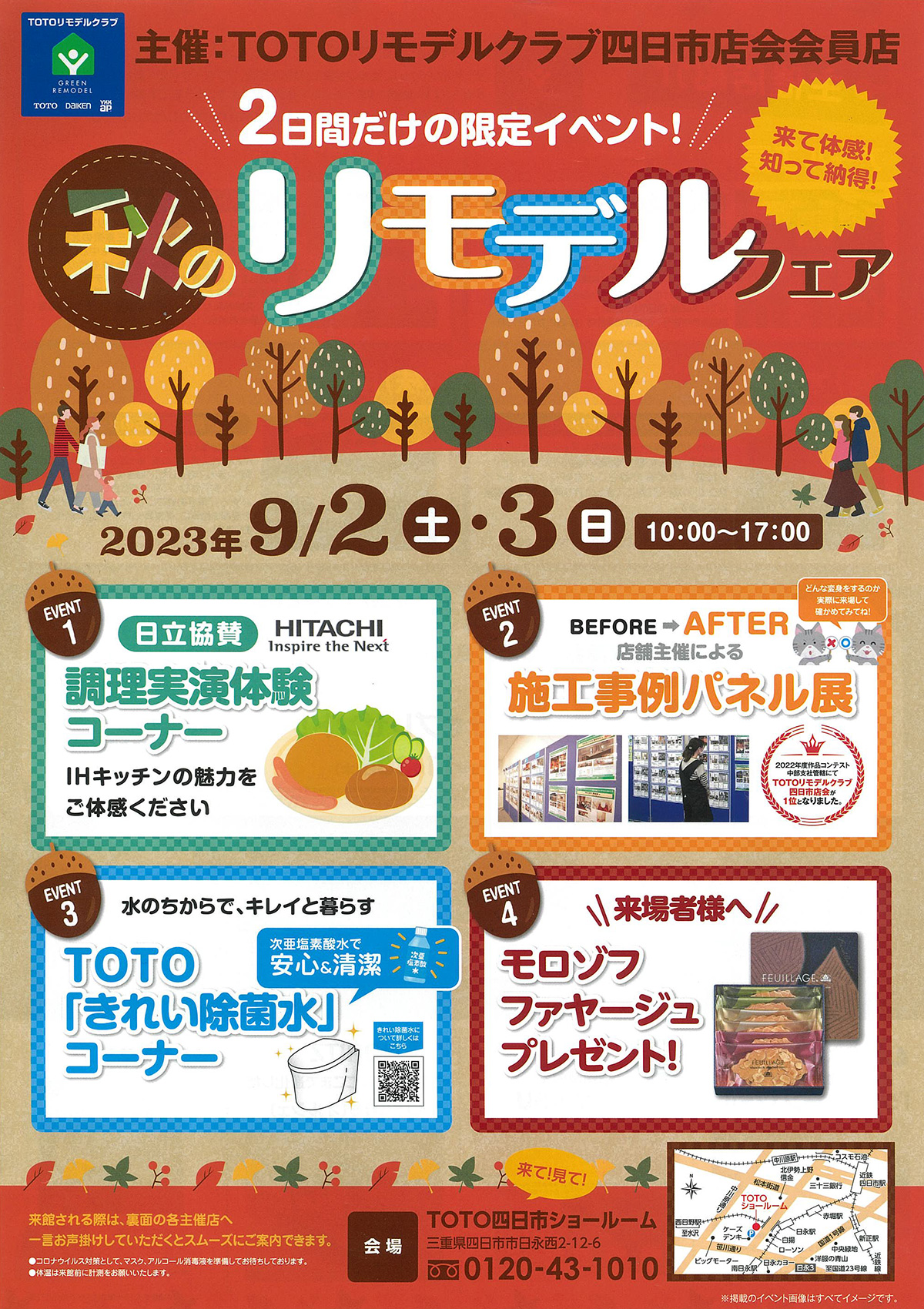 9月2日(土)/3日(日)に、TOTO四日市ショールームにて「秋のリモデルフェア」を開催いたします。