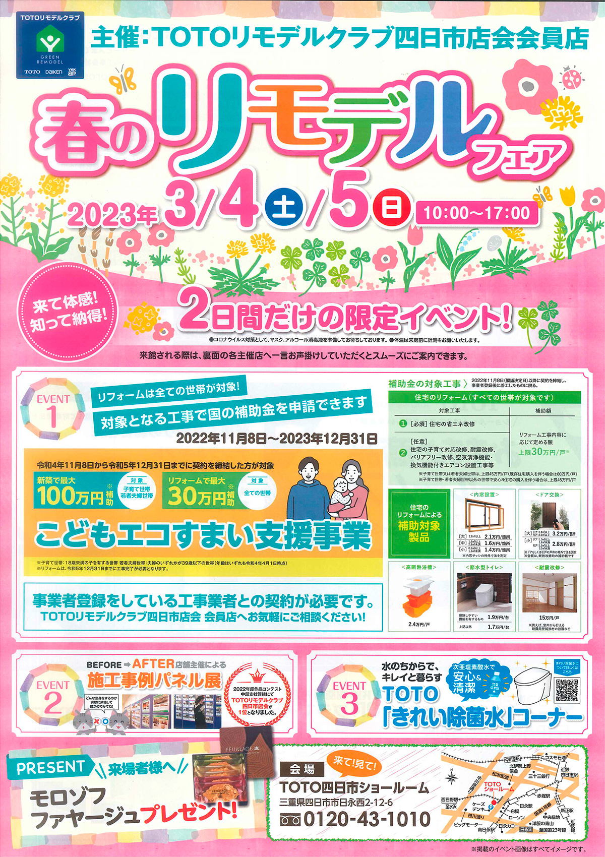 3月4日(土)/5日(日)に、TOTO四日市ショールームにて「春のリモデルフェア」を開催いたします。