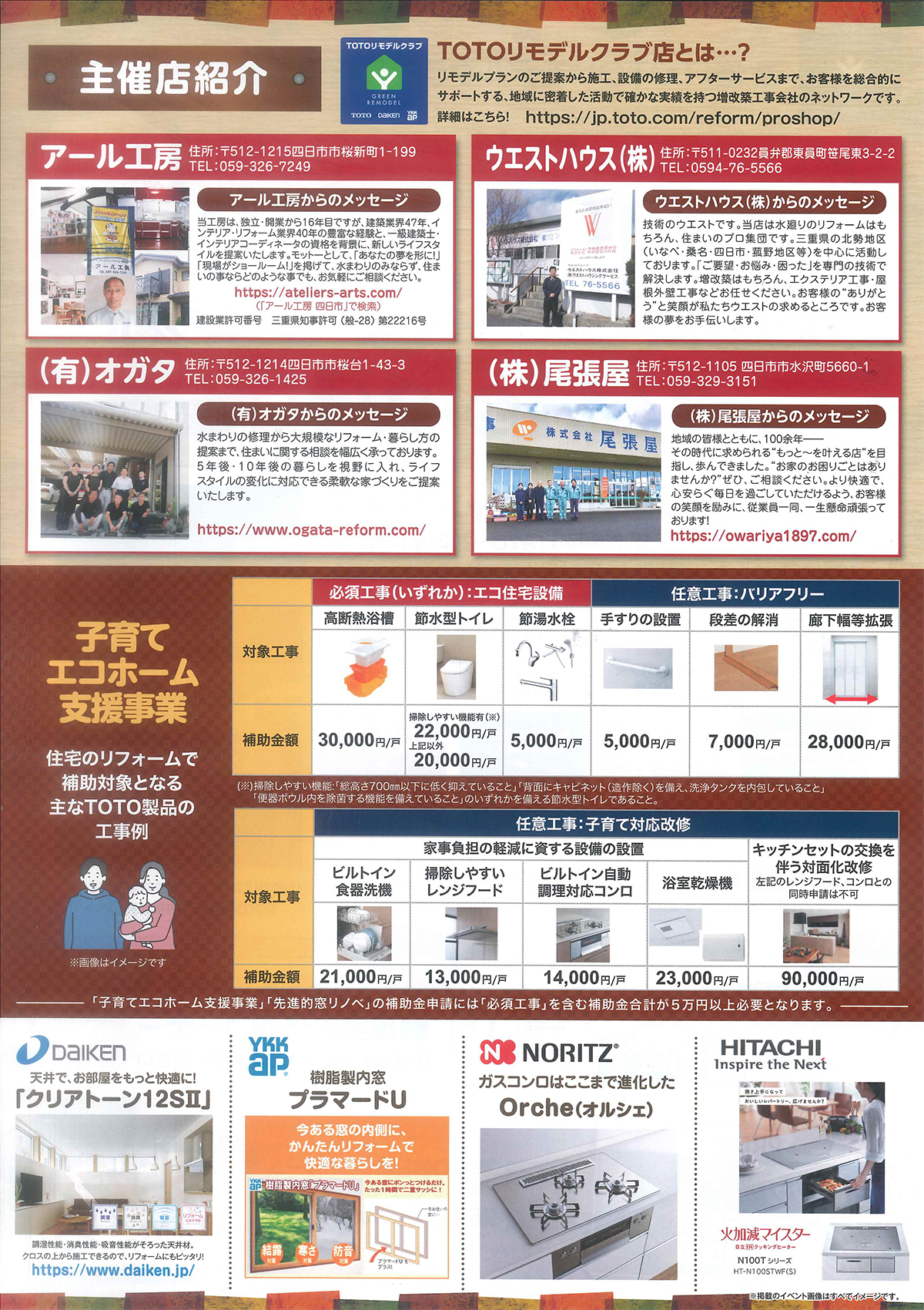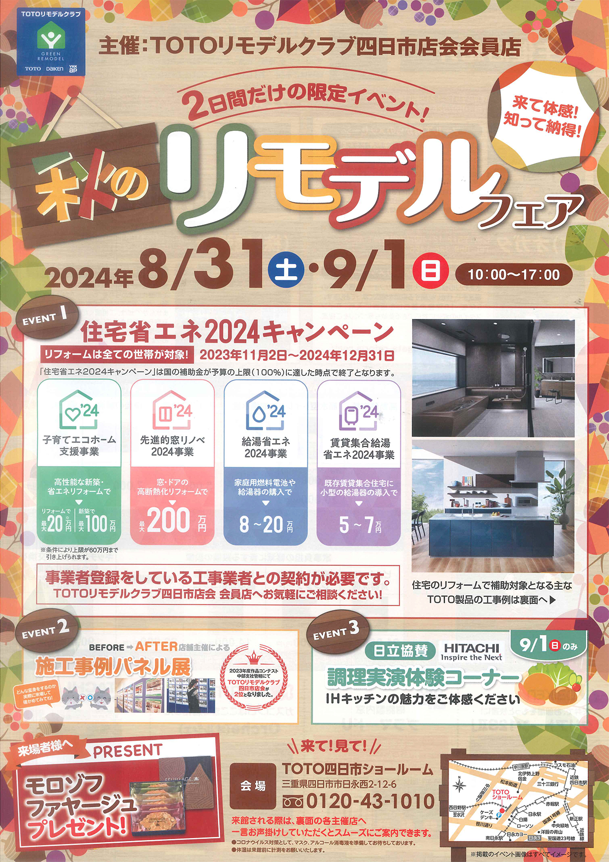 8/31(土)・9/1(日)に、TOTO四日市ショールームにて「秋のリモデルフェア」を開催いたします。
